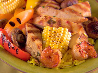 Arrange grilled meats and vegetables over the saffron orzo on a large platter and serve immediately.
