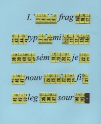 naturalmente non sono riuscito a scannerizzare un bel niente. però qualche immagine l'ho recuperata sul web. questa, per esempio, di Paolo Albani ("mètre à penser", 2001 Frammenti di metro con scrittura 40x30 cm.). L'ironia ha un grande spazio nella poesia visiva. Consente di prendere le distanze dalla solenne pesantezza/pedanteria della tradizione, di togliere l'aureola ai poeti salvatori e a quelli convinti che la saggezza stia ingabbiata nel metro. L'operazione di Albani (Marina di Massa 1946) richiama il Dio cancellatore di Emilio Isgrò, mentre l'uso del francese (che qui s'intravede) ricorda le sperimenazioni di Emilio Villa.