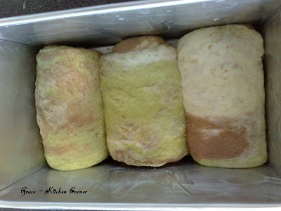 a basic bread" recipe I have made previously. In fact, the cocoa or matcha I added in didn't give much flavor. It was just the color that makes it looks a bit fancy. I divided the dough into three equal portions then continue kneading by adding in 1/4 teaspoon cocoa and 1/4 teaspoon matcha powder for two separate doughs and left another dough stayed plain.