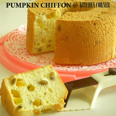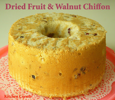 I followed the recipe which I normally use to and all of the recipe at my blog are about the same method is it just about the flavor and additional ingredients for the texture. This is a simple chiffon with some dried fruit & chopped walnut. The texture very cottony soft and fruitful with the walnut gave the crunchy texture was great!