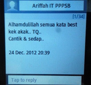 Ini pula sms yg saya terima dr beliau. Alhamdulillah. Maaf ye sbb tak dpt hadir sbb kerja. Utk ARFAH & AMIN selamat PENGANTIN BARU, moga kekal ke akhir hayat dan dianugerahkan anak2 yg soleh.