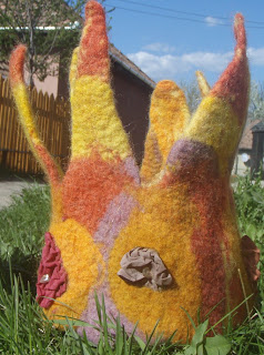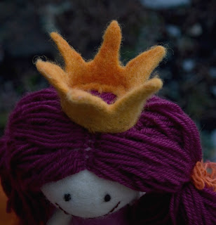 A koronás ötlet utólag jött, és nagyon szépre sikerült, meg vagyok elégedve - ez ugyanis ritka nálam.Nagyon erősre nemezeltem, ruhakeményítővel keményítettem, majd 4 oldalról gyapjúfonallal öltögettem a fejhez.