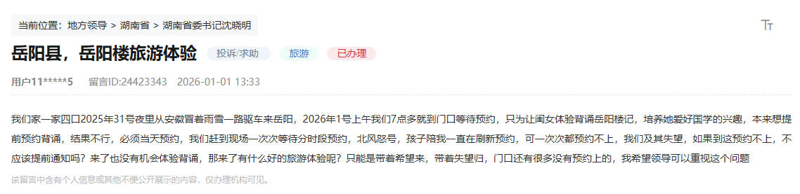 该网友称,2025年12月31日夜里,一家四口从安徽冒着雨雪一路驱车来到岳阳,2026年1月1日上午7点多就到景区门口等待预约,只为让闺女体验背诵岳阳楼记,培养国学兴趣。