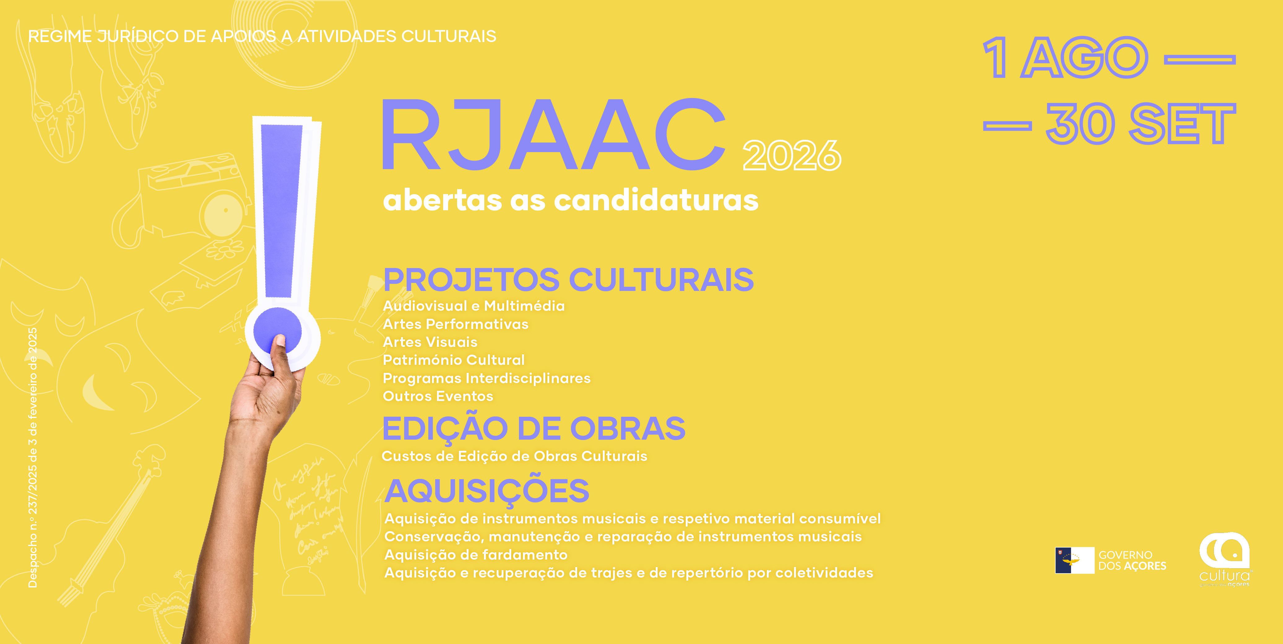 A submissão de candidaturas para o Regime Jurídico de Apoios a Atividades Culturais decorre de 1 de agosto a 30 de setembro. A partir deste ano as candidaturas são efectuadas a partir de uma nova plataforma de apoios disponível em https://apoios.cultura.azores.gov.pt