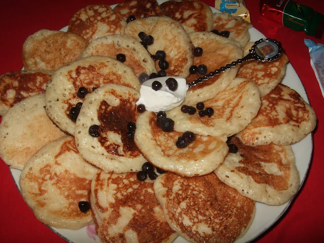 Провокирана съм от прекараните няколко дни в Литва. Няма как да пропусна да приготвя някои рецепти от тяхната кухня. Опитах много вкусни неща. Супите ме изненадаха много приятно, както и някои други неща. Първото нещо, което направих обаче са блините. Там ги хапвахме от бяло или от пълнозърнесто брашно, със сладко, с мед, със заквасена сметана или пък със солени добавки. Вкъщи ги сервирах със заквасена сметана и боровинки и със шоколад. Много са приятни. Определено ни допаднаха.