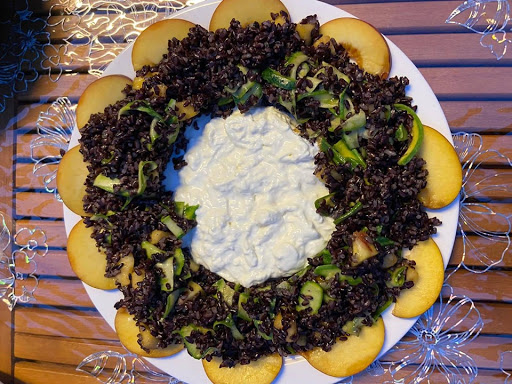 Io ho disposto il riso a corona, versato al centro la stracciatella (o le burrate divise in 4) e messe sottili fettine di pesca intorno.