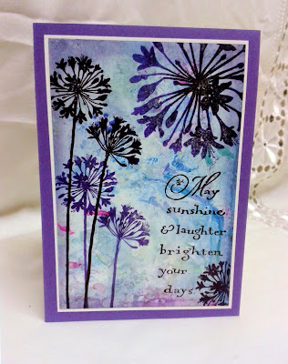 Op deze kaart bloemen met de stempels van Stampendous. De Agapunthus. Wat is dat toch een mooie bloem. Tekst is van All Night Media en met versafine onyx black gestempeld. De rest is met Stazon Royal Purple gedaan.