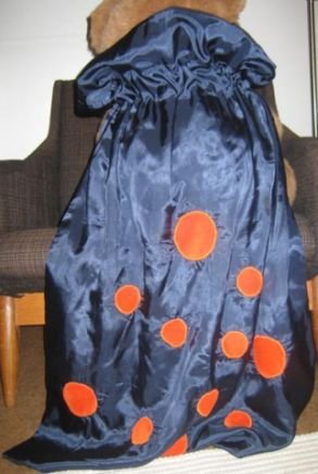 Kultakangas löytyi kierrätyskeskuksesta, verho riitti juuri viittaan ja kruunuun. Musta kangas ja kuminauha omista varastoista. Kiinnitys tarranauhalla turvallisuussyistä. Kuminauhakuja näkyy paremmin pikkuveljen viittakuvista. Tähän tein mokan enkä vaihtanut päällilangaksi keltaista lankaa. Joustava trikoo ja joustamaton liukas kangas ei ollut ehkä kaikista paras yhdistelmä. Laskeutuu tosi kivasti, ompelun kanssa meinas vain välillä olla ongelmia.
