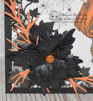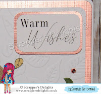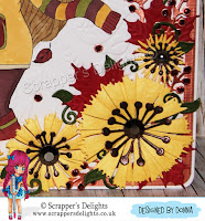 For this, I matt and layered coordinating Trimcraft papers on to a 7x7 card blank along with a hessian/lace ribbon border. The hessian part, I coloured with Promarkers to tone in. The image I printed, coloured then die cut out, adding to die cut card. I decorated with die cut poinsettia flowers, ivy leaves and finished off with sentiment elements from deal and some sparkly gems.
