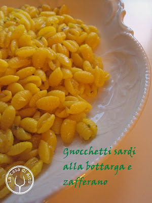- Versare la pasta nella padella. Aggiungere mezzo mestolo di acqua di cottura della pasta in cui avete sciolto lo zafferano e un cucchiaino di bottarga