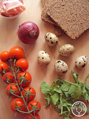 - assemblare il panino così: pane - bacon - cipolla - pomodoro - rucola - ovetto - pepe - pane