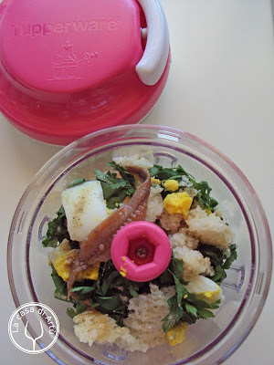 - Tritare finemente prezzemolo, uovo sodo, acciughe sott'olio, sale, pepe e pane ammollato nell'aceto e ben strizzato. Io ho usato il mio TurboChef di Tupperware perchè ho fatto una quantità piccola di salsa.