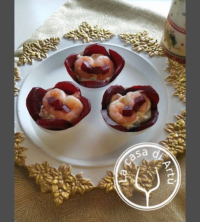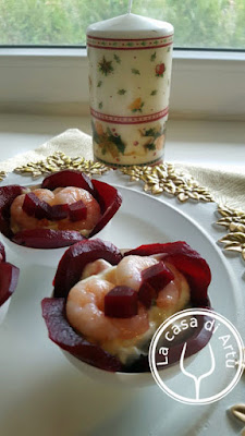E' possibile realizzare la stessa idea presentando il tutto su un piatto da portata tondo egrande, decorando come un grande fiore, magari proprio per le prossime festività natalizie. Il gusto rotondo dell'insalata russa, ricco e grasso si sposa benissimo con il gusto rustico e terroso della barbabietola. Ho scelto questo ingrediente poco utilizzato, poichè ricco di qualità benefiche e soprattutto molto economico!