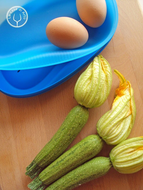 - Mettere le zucchine nel microdelizia tupperware (con coperchio) e cuocere a 600W per 4 minuti (scolare l'acqua se dovesse formarsi), poi adagiare subito i fiori tagliati sopra le zucchine caldissime