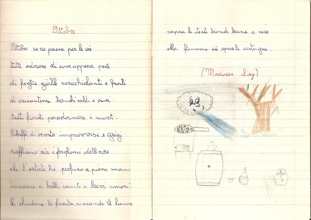 Non ho resistito, ottobre è un mese che mi ha sempre riportato alla mia infanzia e, in particolare, alle scuole elementari.A quando la maestra era una sola ( che bei tempi), per cinque anni ( che utopia!!) e accompagnava realmente in una crescita che dal mondo dell'infanzia portava alla preadolescenza.