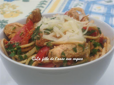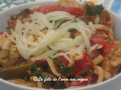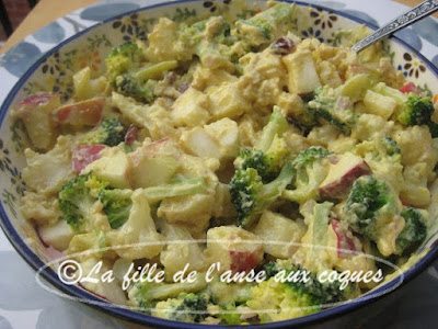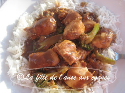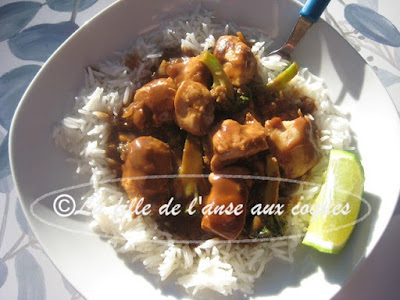 Ces derniers temps, je ne pète pas la forme. Ça explique peut-être la raison pour laquelle j'ai complètement oublié d'ajouter la garniture d'arachides sur les portions de ce plat de poulet déniché ici. La recette originale propose de faire une garniture d'épinards frits. J'adore les épinards frits, mais j'essaie d'éviter autant que possible la friture. J'ai donc décidé de substituer par du brocoli que j'ai intégré à la sauce, ainsi que de l'oignon que je trouvais indispensable dans cette recette. Tout ça donne évidemment une toute autre allure au plat, mais je ne crois pas qu'on y perde au change. Ma seule déception aura été mon oubli pour les arachides. Je vous conseille évidemment d'en mettre. Ce plat est délicieux. La sauce au beurre d'arachide garni de brocoli nous a conquise. S'il y avait eu des arachides, elles auraient garni parfaitement le plat, et donné du croquant. Et si vous préférez utiliser les épinards, je suis certaine que ce sera aussi bien bon. :-)