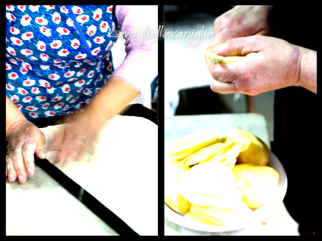 | Mia suocera stende l'impasto delle pizze mentre la zia affetta le patate |
