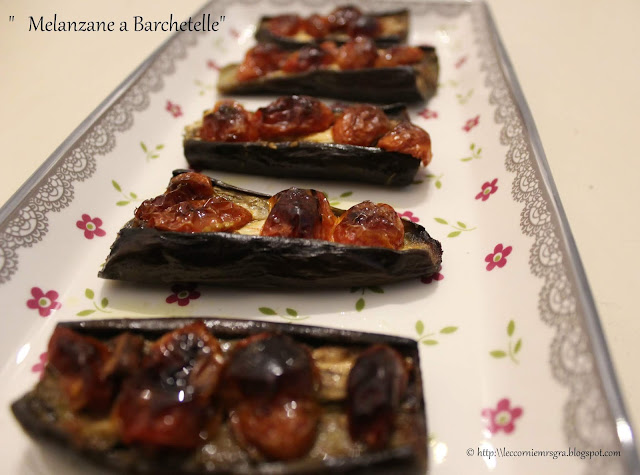 Per prima cosa ho inciso dei tagli a forma di rombo sulle porzioni, cercando di non tagliare anche la buccia esterna. Ho diviso per il lato lungo dei pomodorini del tipo "datterini", schiacciando il succo interno, sulla porzione di melanzana guarnendo con gli stessi pomodorini, come vedete nelle immagini, aggiungendo:
