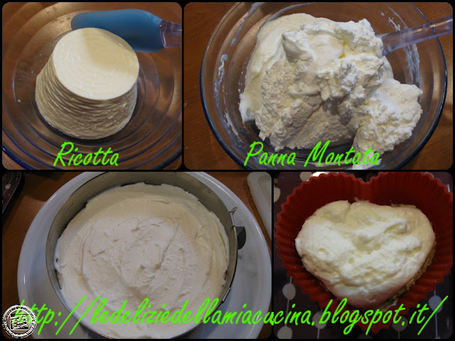 In un'altra ciotola mescolare la ricotta con i 100 ml di panna (precedentemente montata) e 3 fogli di gelatina (precedentemente ammollati in acqua fredda e strizzati) sciolti in 3 cucchiai di panna.