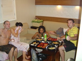 And here we are back in our room the next day with some friends that the wind blew in. We ordered some delivery food and Ben was still keen on drinking soju. I lent them my spare shorts and we hung out in the sauna for a couple of hours. Daniel and Alex on the left are from Sweden but they live and teach in Thailand.