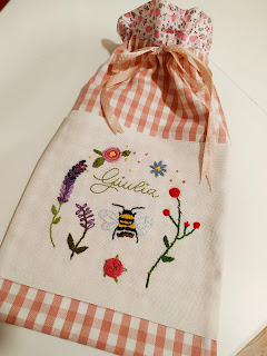 Ha fatto tutto da sola, mi è sembrato giusto utilizzare il suo imparaticcio per cucirle un sacchettino, questo è il risultato: