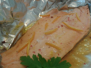Occorre un filetto di trota salmonata, il succo di mezza arancia spremuta, filettini di scorza di arancia, un poco di sale e bacche di pepe rosa, pochissimo olio.
