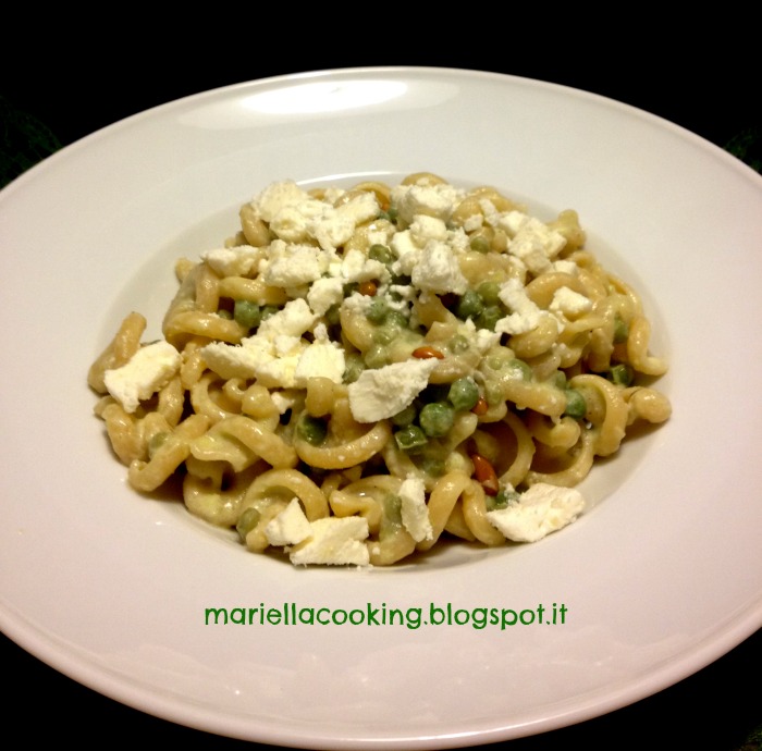 Pasta con piselli, yogurt, feta e pinoli