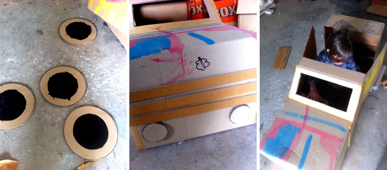 Moo loves pretending to drive her dad's car so I decided to make her own cardboard car to have in the garage with keys, dashboard, working streering wheel and all.