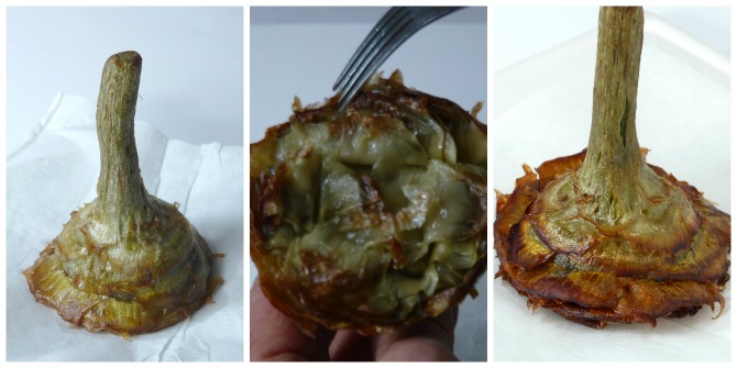 Quando saranno quasi cotti, ovvero si potranno inserire i rebbi di una forchetta nel fondo del carciofi, li togliamo, allarghiamo