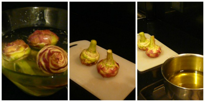 | Carciofi"capati a rosetta"e immersione nell'acqua acidulata per evitare l'ossidazione