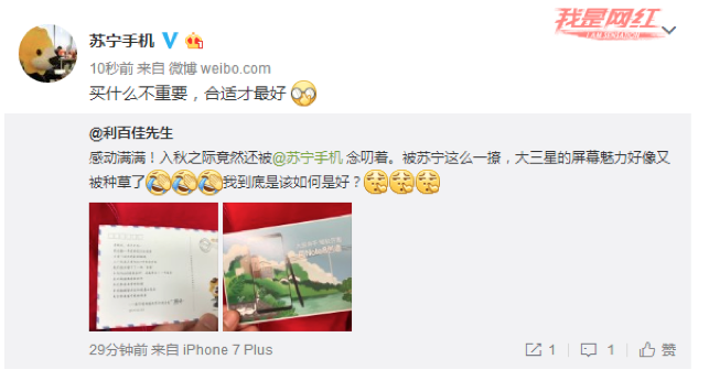 作为苏宁老粉,他不止一次在苏宁买过手机,他也没想到,去年买过三星Note7后的一年,会再次被苏宁念叨,这是从来没有的体验。邮寄明信片,激发了苏宁手机与每一位老粉之间最真实的和亲密的互动关系。