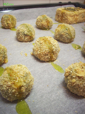 Fare con gli spinaci delle palline strette strette dal diametro di 4 cm. circa, o comunque a vostro piacere. Rotolarle prima nella farina facendo un bello stratone, poi nell'uovo, senza lasciare spazi vuoti e infine nel pangrattato (tanto perchè più ne mettete e più sararno croccantosissime).