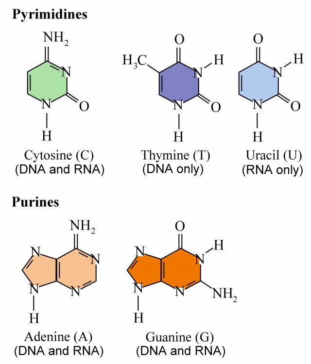 DNA or deoxyribonucleic acid is a large molecule structured from chains of repeating units of the sugar deoxyribose and phosphate linked to four different bases: Adenine, Thymine, Guanine, and Cytosine. Ribonucleic acid (RNA) is a single-stranded copy of DNA, in which the Thymine is replaced by Uricil; (More information on transcription is available here).