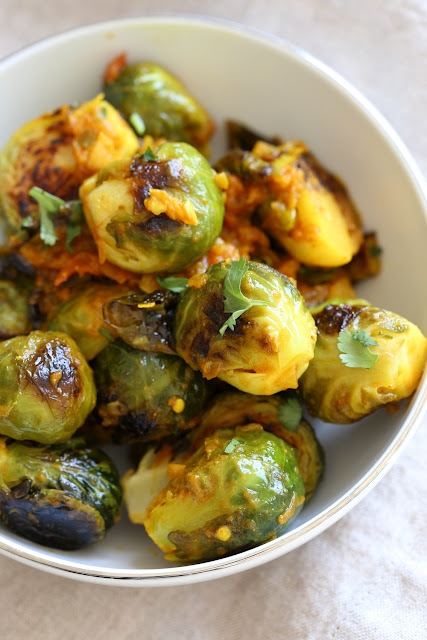 Aggiungi le bruxelles, 1/8 di cucchiaino di sale e 1/4 di tazza di acqua in più. Mescolare bene, coprire e cuocere a vapore per 4-5 minuti. Assaggia e regola sale e sapore. Aggiungi più sal o garam masala secondo necessità. Cuoci a vapore per un po 'di più se i bruxelles non sono cotti secondo le preferenze.