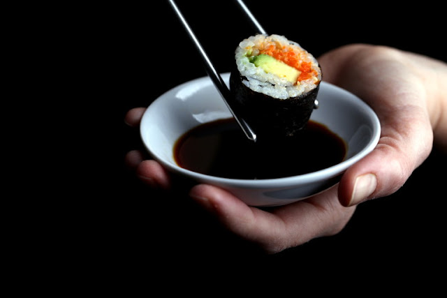 Posizionare su un piatto da portata, ripetendo il processo per fare 4 rotoli. Servire con salsa di soia, wasabi e zenzero sottaceto, se lo si desidera.
