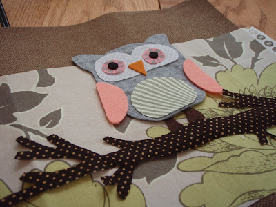 I put quite a few owls in the mix, I just couldn't stop with the feathered friends once I got started. Here is my favorite owl before he got sewn on, I think he's my favorite 'cuz he's so tiny (around 3 inches tall).