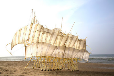 Theo Jansen uses plastic yellow tubing to create these beach walking creatures. Since 1990 he has created these beautiful moving creatures - take a look on his website here - but be warned it's mesmerizing!