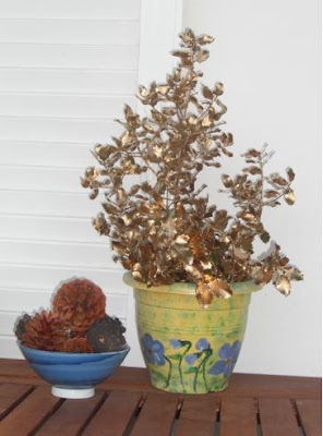 Στη γλαστρούλα μερικά κλαδάκια χρυσαφιά,που κι αυτά τα κυνηγούσα το βράδυ,ώσπου βαρέθηκα και το πρωί τα βρήκα κάτω, στην πίσω αυλή.Δίπλα τα κουκουνάρια μου.