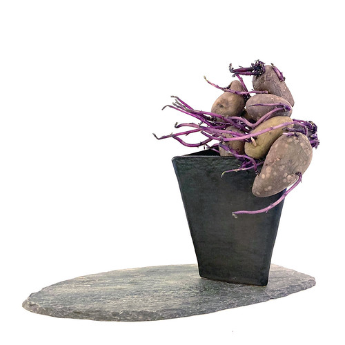 When coming back from my summer vacation I was surprised to find that the almond potatoes left in the refrigerator had grown beautiful purple sprouts while I was away - an opportunity that can't be missed! The sprouts gives the potatoes an interesting energy, and turn them into a perfect material for a contemporary ikebana arrangement.
