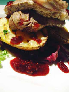 Coloque no centro do prato a couve roxa e disponha a carne por cima. Finalize com a compota de framboesa e salsa picada.