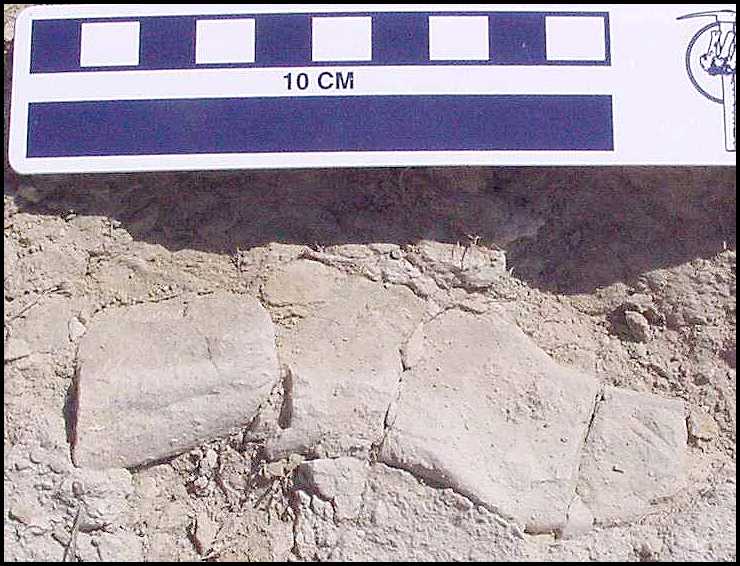 3) One of the first things I saw were fragments of what appeared to be bone on the surface of the weathered limestone. Bone or vertebrate remains of any kind are rare here. (Scale = cm) When I picked it up, I noticed that the fragments had a dentine-like coating on the surface. |