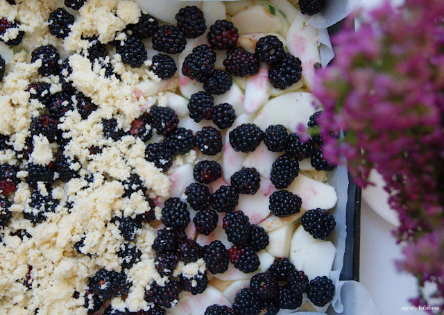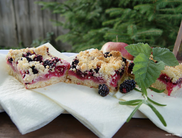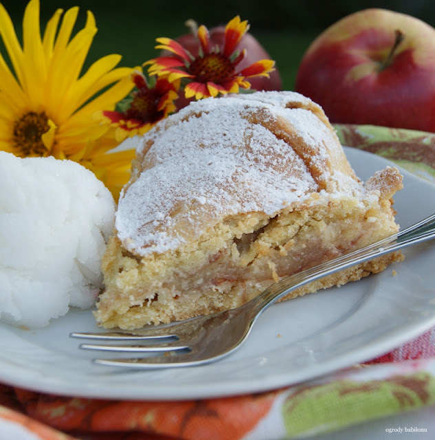 Mąkę posiekać z masłem, dodać żółtka, cukier, śmietanę i sól. Ciasto zagnieść, wyrobić i włożyć do lodówki na 2 godziny, owinięte w folię spożywczą. Schłodzone ciasto podzielić na 2 części. Jedną rozwałkować i wyłożyć nią dno i boki formy na tartę o średnicy 25 centymetrów. Spód posmarować roztrzepanym białkiem, ponakłuwać widelcem i podpiec w temperaturze 160º C przez 15 minut. Na podpieczonym cieście ułożyć jabłka, ściśle, jedno obok drugiego, przykryć pozostałym rozwałkowanym ciastem, wysmarować białkiem i piec jeszcze 60 minut w temperaturze 160º C. Ciasto podawać oprószone cukrem pudrem.
