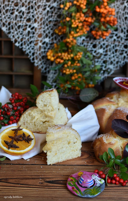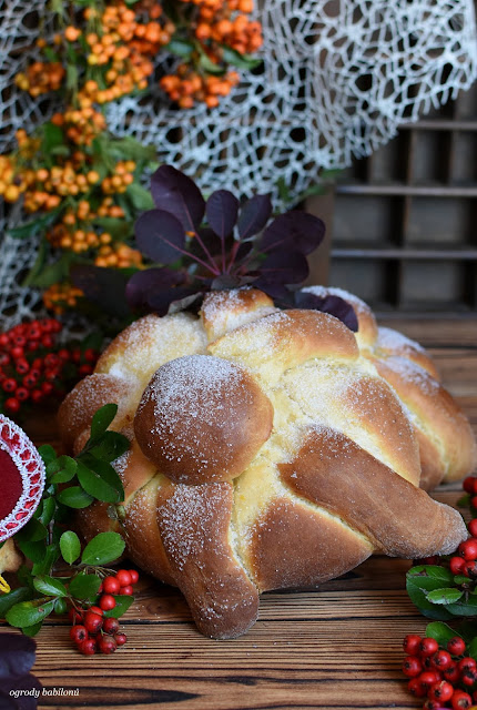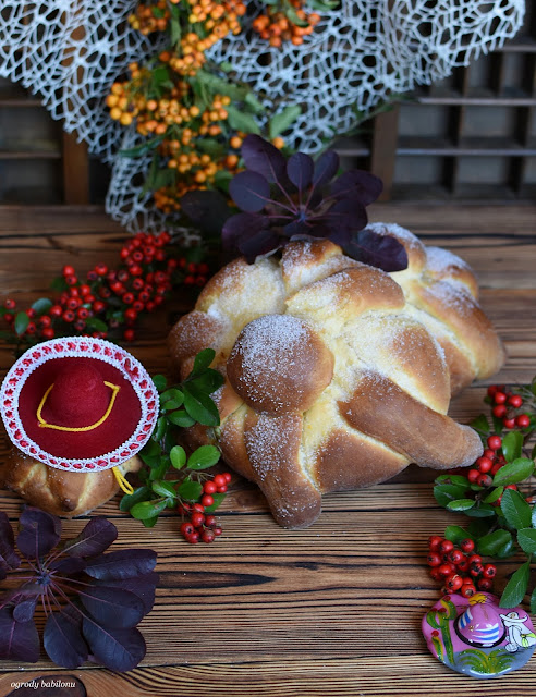 W miseczce połączyć drożdże z ciepłym mlekiem. W misce ubić jajka z cukrem, solą, dodać mielony anyż, skórkę startą z pomarańczy, wodę i ubić. Dodać drożdże, mąkę oraz miękkie masło i wyrobić elastyczne ciasto. Ciasto pozostawić w misce, przykryć ściereczką kuchenną, odstawić do wyrośnięcia w ciepłym miejscu na około 60 minut. Po tym czasie ciasto wyłożyć na posypaną mąką blat, podzielić na 3 części, z dwóch uformować okrągłe bochenki, które ułożyć na blasze wyłożonej papierem do pieczenia. Z pozostałego ciasta uformować 6 wałeczków na kształt kości i 2 małe kulki. Wszystko przykryć ściereczką kuchenną i odłożyć do wyrośnięcia na około godzinę. Na wyrośnięte bochenki ułożyć po trzy wałeczki i kulkę ciasta na środku. Blachę włożyć do piekarnika nagrzanego do 180° C i piec około 40, aż chlebki się zrumienią.