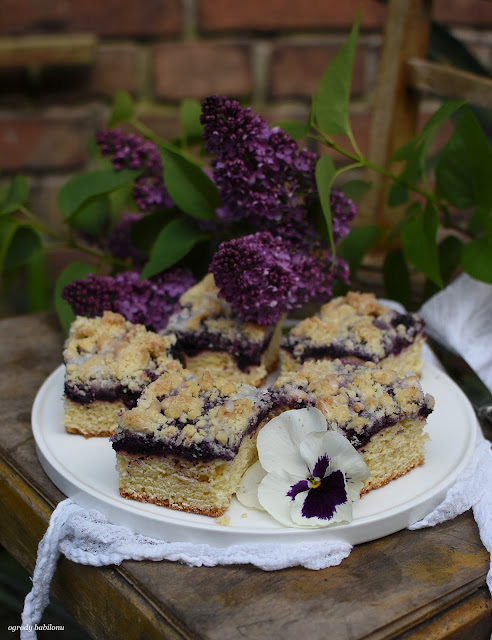 W misce rozetrzeć podane składniki tworząc kruszonkę. Na cieście rozsypać kruszonkę. Ciasto wstawić do piekarnika nagrzanego do 170º C i piec przez około 50 minut.