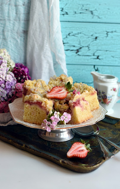 Ucierane ciasto z twarogiem i truskawkami, jest puszyste, mięciutkie i doskonale smakuje. W cieście, które można szybko przygotować, ucierane ciasto zostało połączone z masą serową o waniliowym aromacie, truskawkami i chrupiącą kruszonką.