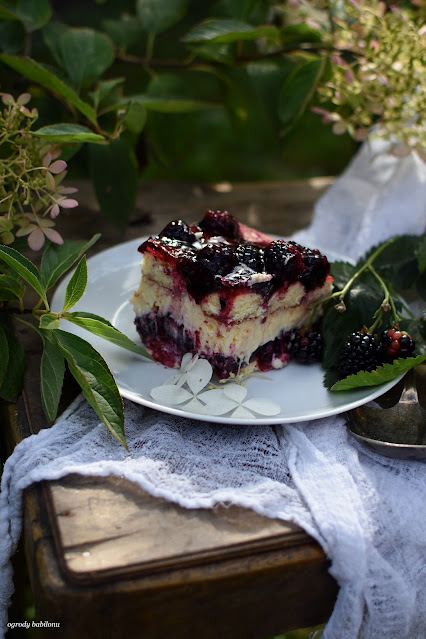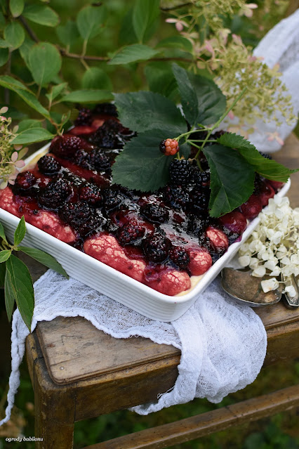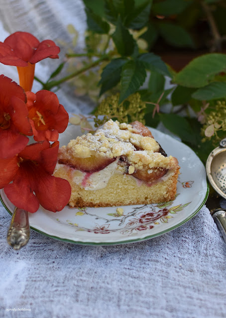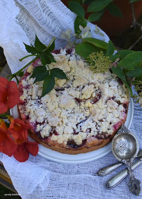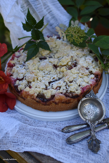 W misce rozcierać palcami mąkę, cukier oraz masło, aż powstanie kruszonka. Na cieście rozsypać kruszonkę. Blachę z ciastem wstawić do piekarnika nagrzanego do 180° C. Piec ciasto około 50 minut, aż brzegi ciasta ładnie się zrumienią na złoty kolor, wówczas sprawdzić patyczkiem środek ciasta, patyczek powinien być suchy. Ciasto podawać posypane cukrem pudrem.