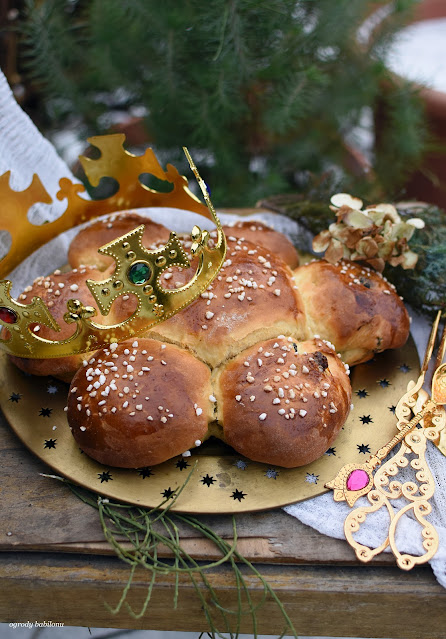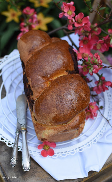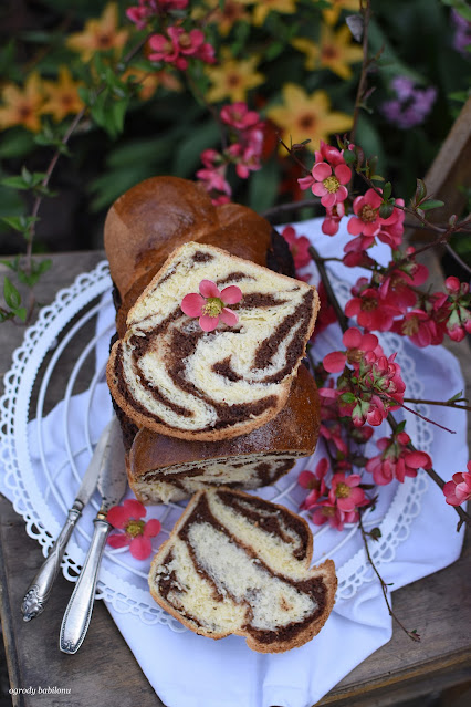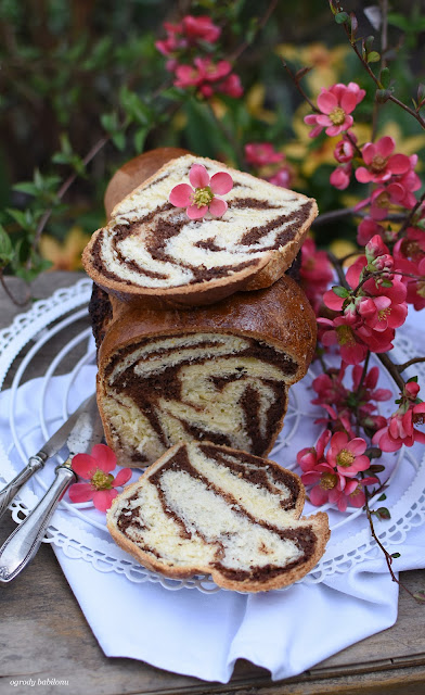 W misce połączyć drożdże z mlekiem i cukrami, dodać mąkę, jajka, miękkie masło, sól, skórkę z cytryny i wyrobić elastyczne ciasto. Ciasto przykryć ściereczką kuchenną, pozostawić do wyrośnięcia w ciepłym miejscu na około 60 minut. Po tym czasie włożyć ciasto do lodówki na noc. Na następny dzień wyłożyć ciasto na blat posypany mąką blat, podzielić na dwie części. Porcję ciasta rozwałkować na posypany mąką blacie na prostokąt, na nim rozsmarować nadzienie serowe, zostawiając kilka centymetrów wolnego miejsca z każdej strony. Ciasto zwinąć jak roladę. Z drugim kawałkiem postąpić tak samo, tylko użyć makowego nadzienia. Następnie zapleść rolady ze sobą naprzemiennie i ułożyć w formie do babki z kominem, wysmarowanej masłem i wysypanej mąką. Ciasto przykryć ściereczką kuchenną i pozostawić w ciepłe miejsce do wyrośnięcia. Babkę włożyć do piekarnika nagrzanego do 180° C i piec około 40 minut, aż patyczek wbity w ciasto zostanie suchy.