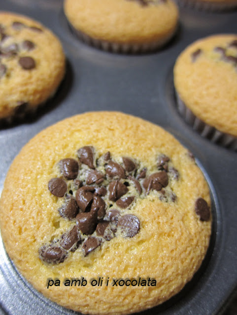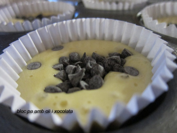 Poseu la massa a la màniga i ompliu els motlles fins uns 3/4. Tireu els bocins de xocolata per a sobre i enforneu entre 15-18 minuts (depenent del vostre forn)