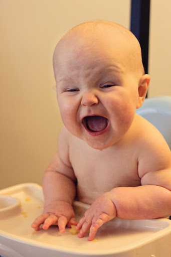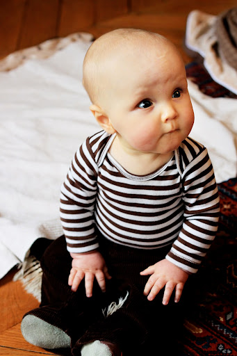He's also thoroughly enjoyed his new high chair (can you tell he just woke up here?), where meal times are his favorite part of the day. Because I'm succumbing to the pressure of other moms who have posted these facts, I'll share that his list of foods has gotten rather long (despite the 5-day wait rule to watch for allergies), and he loves every bit of it! He's eaten rice and oatmeal; turkey, chicken, beef, veal, and salmon; potatoes, sweet potatoes, carrots, pumpkin, winter squashes, and zucchini; peas, green beans, broccoli, lentils; apples, pears, prunes, and bananas. His favorite finger foods are rice cakes and green beans, and he eats most things very finely chopped now, but no longer really pureed.