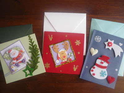 Seconde série: le travail de Pauline, avec un peu d'aide quand même, mais elle commence à avoir ses idées à elle. A gauche, une vignette en relief à monter, collée sur une carte verte métallisée (toujours Zeeman), un peu de ruban, une petite branche de thuya (les pauvres auront payé de leur personne, cette année ^^), et une étoile verte. La vignette de celle du milieu est une étiquette pour cadeau de Noël (Gifi) dont on a retiré la partie du dessous, avec une sorte de mini guirlande collée autour (Gifi encore), et quelques peel off. Et pour finir, quelques éléments de feutrine et un peu de peel off sur une carte bleue métallisée.